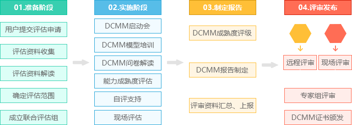 DCMM评估流程分为4个阶段,即准备阶段、实施阶段、制订报告阶段和评审发布阶段。DCMM授权评估师会在每个阶段充分参与,指导公司进行DCMM贯标。