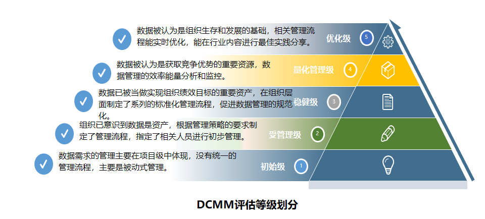 在进行DCMM贯标评定时,按照企业的数据管理情况,又具体划分为5个等级的成熟度。